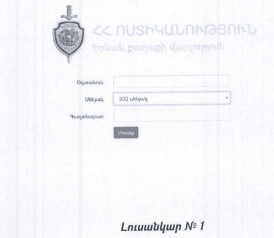 12. Հարցաքննություն իրականացնող ոստիկանության ծառայողը համոզվելով, որ հարցաքննությունը սկսելու համար կան բոլոր նախադրյալները, նախապես իրեն հատկացված գաղտնաբառի միջոցով, նշելով աշխատասենյակի համարը, (տե՛ս, Լուսանկար N 1) մուտք է գործում տեսաձայնագրման համակարգ: