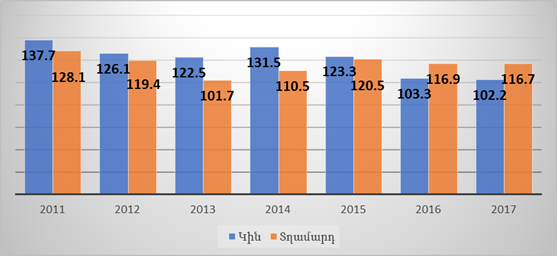 13. Ինչպես երևում է գծապատկեր 8-ից, չնայած 2017թ.-ին 2016թ.-ի համեմատ բնակչության թվաքանակի 0.44%-ով նվազման, աշխատանքային ռեսուրսները և տնտեսապես ակտիվ բնակչության թվաքանակն աճել է համապատասխանաբար 0.49%-ով և 0.37%-ով: Դիտարկվող ժամանակաշրջանում նշված երեք ցուցանիշները դրսևորում են ընդհանուր նվազման տենդենց, ինչը ներկայացված է գծապատկեր 9-ում: