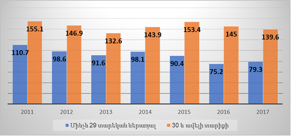 Մինչև 29 տարեկան զբաղված երիտասարդների թիվը նվազել է տարեկան միջինը 3.44%-ով, իսկ 30 և ավելի տարիքի զբաղված անձանց թիվը տարեկան միջինը 1.67%-ով: